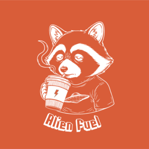 ☕👽 Ce raton fatigué mais stylé carbure à la caféine intergalactique. Design vectoriel au look rétro-futuriste, idéal pour les amateurs de café